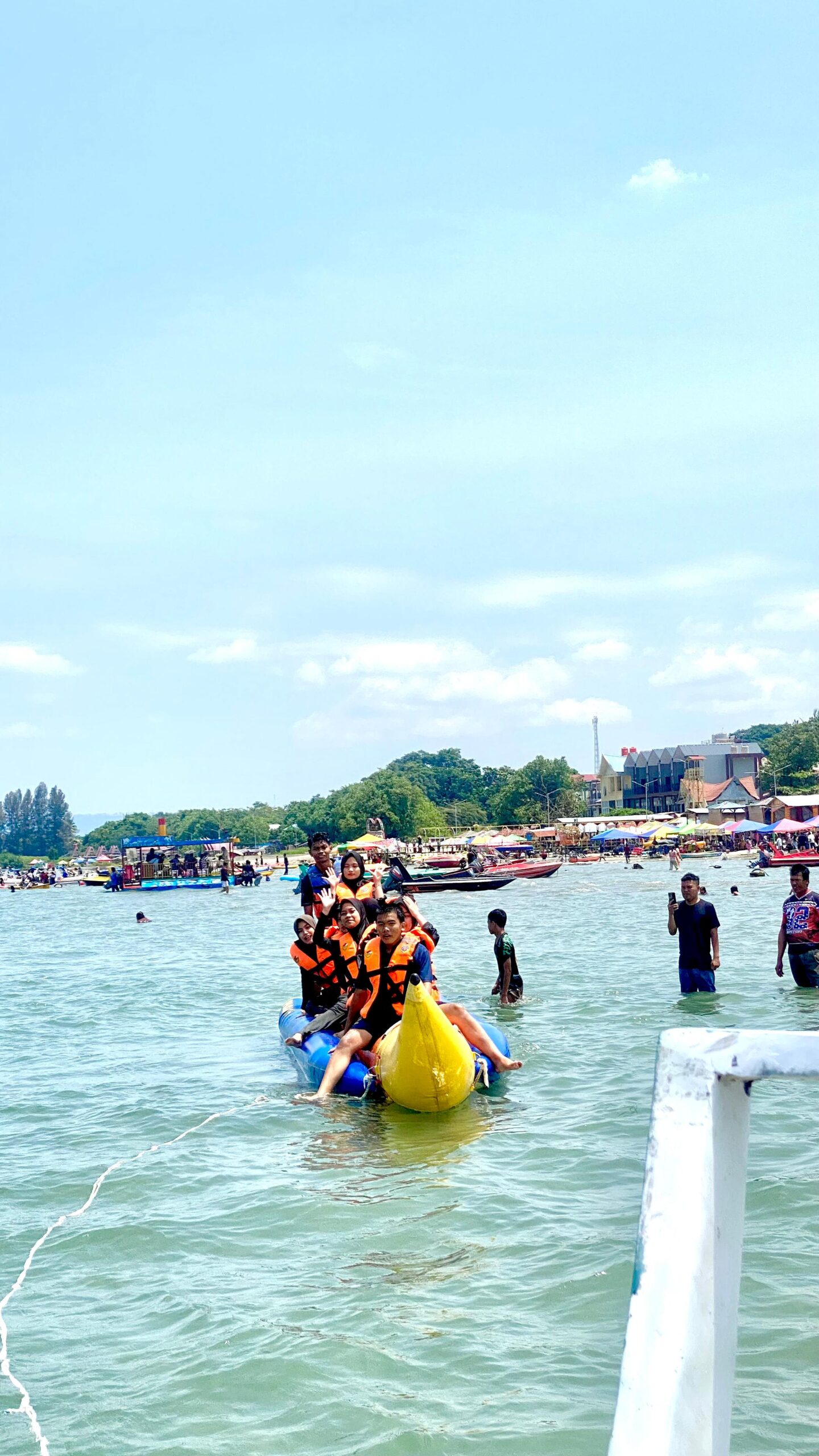 Aktivitas banana boat menjadi salah satu favorit, terutama bagi kalangan anak muda dan keluarga yang ingin merasakan sensasi seru di atas air. Tawa dan sorak-sorai pengunjung terdengar hampir di sepanjang garis pantai.
