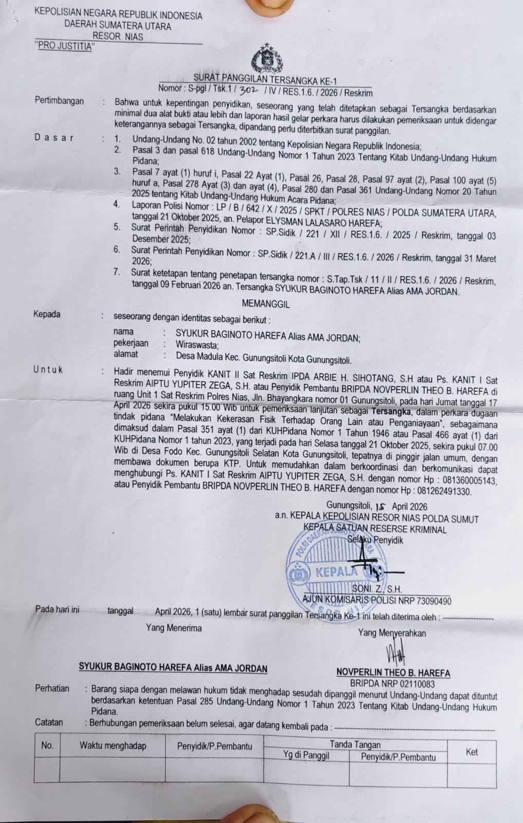Hingga saat ini, Syukur Baginoto Harefa telah resmi ditetapkan sebagai tersangka ditandai dengan nomor ; S.pgl / Tsk.1 /  302 / IV / Res .1.6 / 2026 / Reskrim , dalam kasus tersebut .